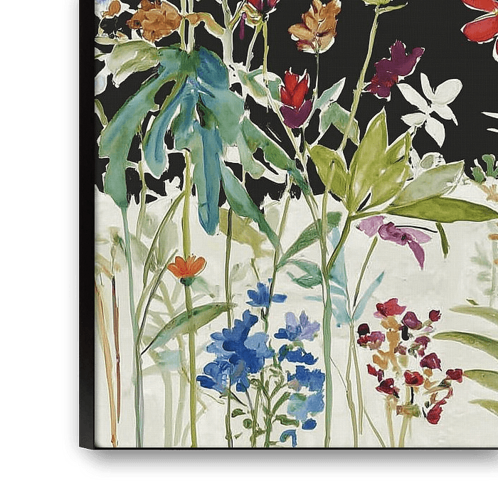 Die farbenfrohen Blumen und Blätter heben sich stark von dem tiefschwarzen Hintergrund ab, wodurch jedes Detail besonders intensiv wirkt. Die Schmetterlinge und Libellen unterstreichen die sommerliche und verträumte Atmosphäre.