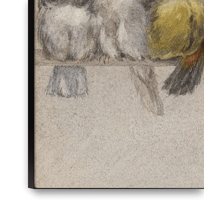 Vierundzwanzig Finken, die in Pose und Farbe variieren, sitzen in einer Reihe. Dieses Aquarell ist eine Variante eines der beliebtesten Sujets des Künstlers, "Un bâton de cage."