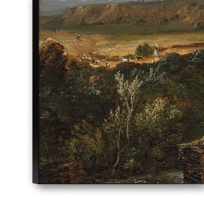 A View near Tivoli (Morning)" ist eine meisterhafte Landschaft von Thomas Cole, dem Begründer der Hudson River School. Das 1832 nach seiner ersten Italienreise gemalte Werk verkörpert die Ideale der Romantik. Es zeigt einen majestätischen und kontemplativen Blick auf die italienische Landschaft, in der die Erhabenheit der Natur mit dem malerischen Verfall des antiken Römischen Reiches verschmilzt.