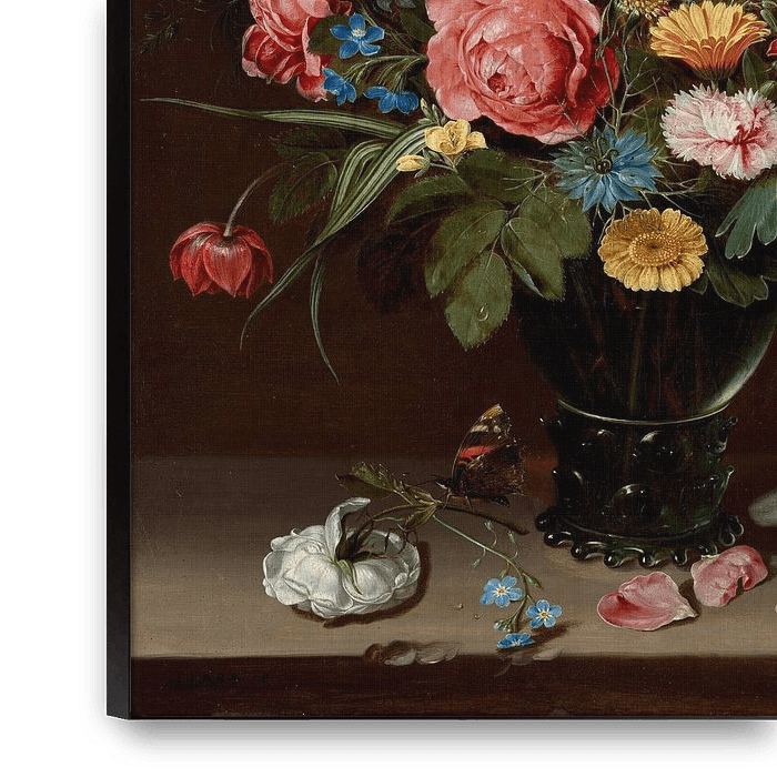 Clara Peeters gehört zu den Begründern des europäischen Stilllebens, einer Gattung, die viele Künstlerinnen anzog, die nicht die Möglichkeit hatten, Aktmodelle zu studieren. In dieser ehrgeizigen Komposition achtete Peeters auf naturalistische Details wie Tautropfen, Insektenstiche und herabhängende Tulpen, die auf Vergänglichkeit und Verfall hinweisen. Gleichzeitig bekräftigte sie ihre eigene Leistung, indem sie ihre Signatur in den Steinsims eintrug, neben dem ein abgefallener Zweig mit Vergissmeinnicht steht. Die scharfen Kanten und die genaue Beobachtung, die ihr Werk kennzeichnen, verdeutlichen die enge Verbindung zwischen Blumenmalerei und botanischer Illustration während der wissenschaftlichen Revolution.