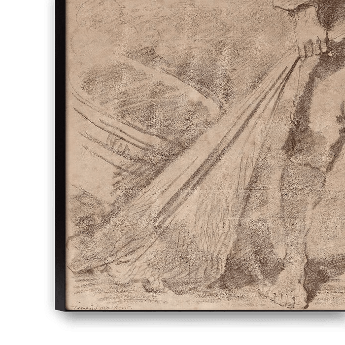 Dieses Werk des französischen Rokokokünstlers Jean-Honoré Fragonard zeigt einen Fischer, der barfuß, in ländlicher Kleidung und mit einem breitkrempigen Hut bekleidet ist. Er hält sein Netz mit beiden Händen, seine Pose deutet die körperliche Anstrengung seiner Arbeit an. Fragonards schnelle, fließende und selbstbewusste Linien verleihen der Figur ein Gefühl von Leben und Bewegung. Die Zeichnung ist keine steife, akademische Studie, sondern eine lebendige und sympathische Beobachtung eines einfachen Menschen.