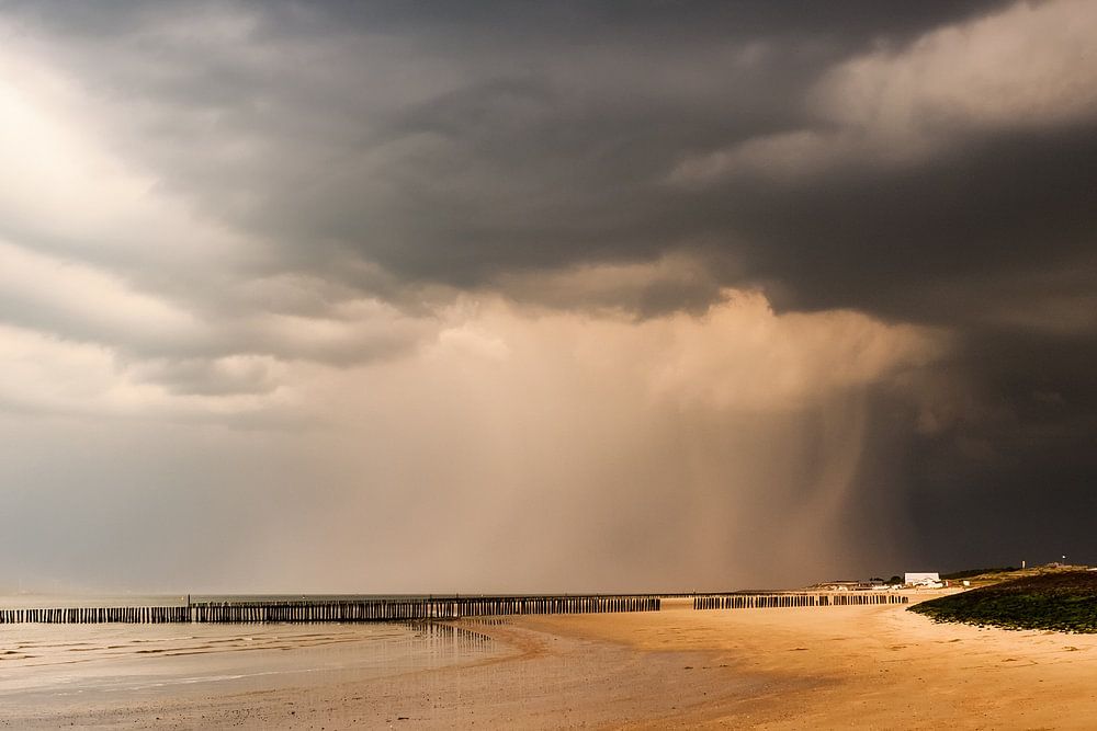 Ein Gewitter nähert sich Breskens in Zeeland und eine Regenwolke wirft seinen ersten Regen auf den Strand. Der charakteristische weiß-schwarze Leuchtturm von Breskens kontrastiert schön mit dem ominösen dunklen Himmel .... Die Badegäste haben den Strand weise verlassen.