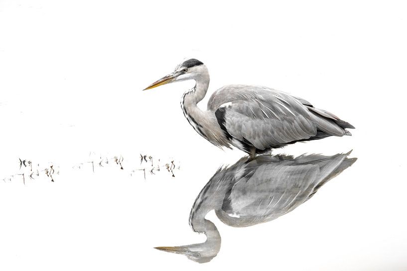 Bestelle dieses Vögel Wandbild Ein Graureiher auf dem Wasser. von Christiaan Heirman als Reproduktion auf Leinwand, Alu-Dibond, als Poster, Fototapete, ArtFrame oder Acrylglasbild, maßgefertigt in höchster Qualität.