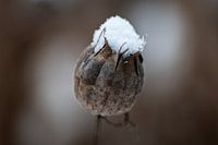 Eine schneebedeckte Samenbirne von einer blühenden Dame im Grün.