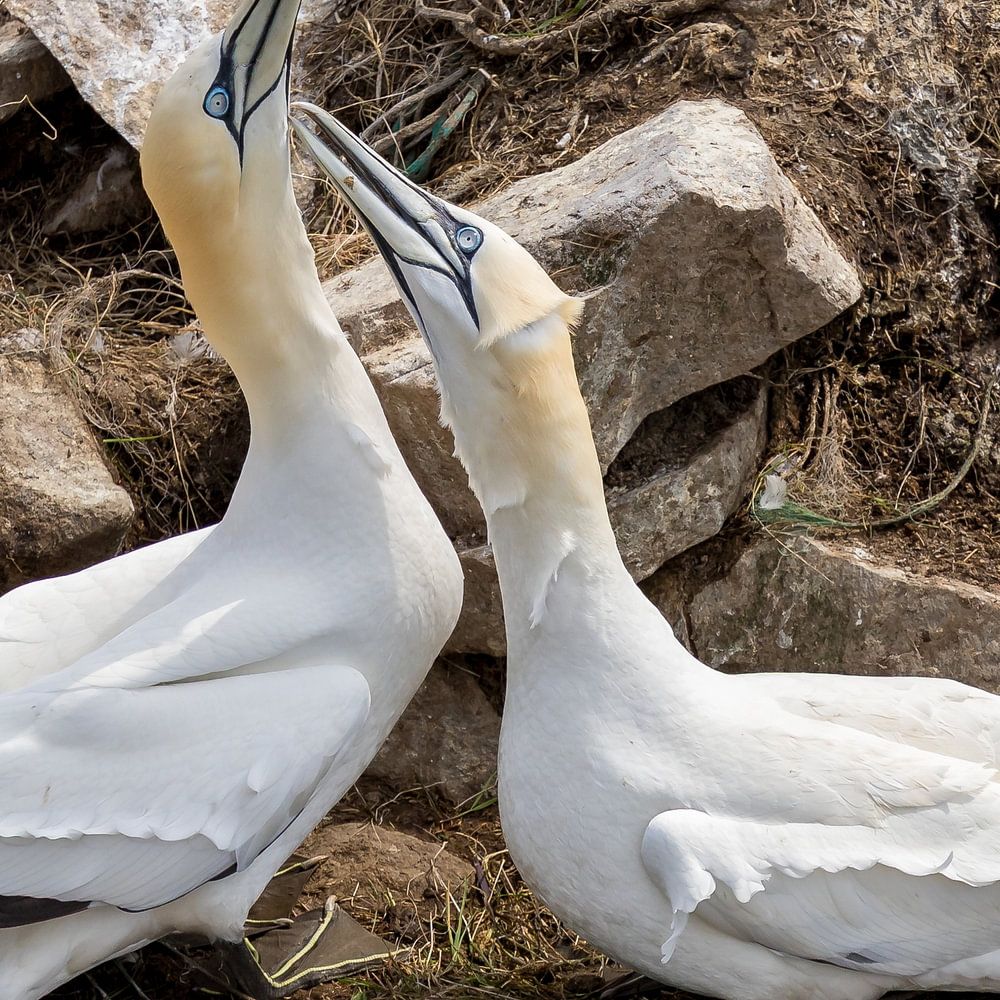 Ein Paar Basstölpel begrüßt sich liebevoll auf den Felsen von Neufundland.