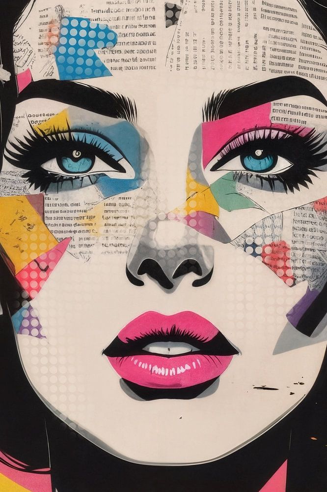 Ein Pop-Art-Plakat einer Frau mit einer prominenten weiblichen Figur mit rätselhaftem Ausdruck, verziert mit Collage-Fragmenten aus Zeitungsausschnitten, zerrissenem Papier und abgenutzten Texturen, vor einem Hintergrund aus widersprüchlichen Farben und verschiedenen Mustern,