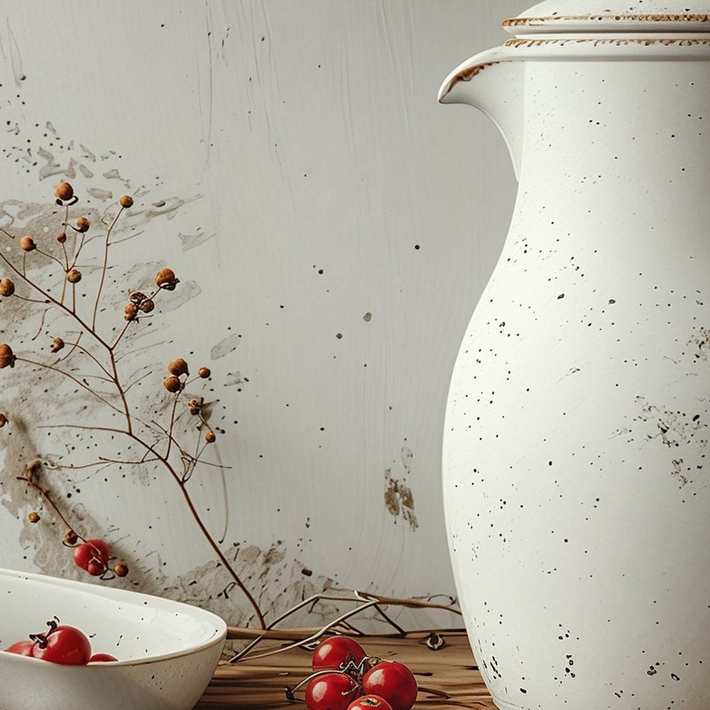 ein stillleben mit einem milchkännchen aus steingut, das auf einem alten, verwitterten holzbrett steht. daneben stehen weiß-beige schalen mit roten beeren und ein alter silberlöffel, der auf einem verwitterten, alten, weißen hintergrund liegt. anspielung auf den ländlichen stil, minimalismus.