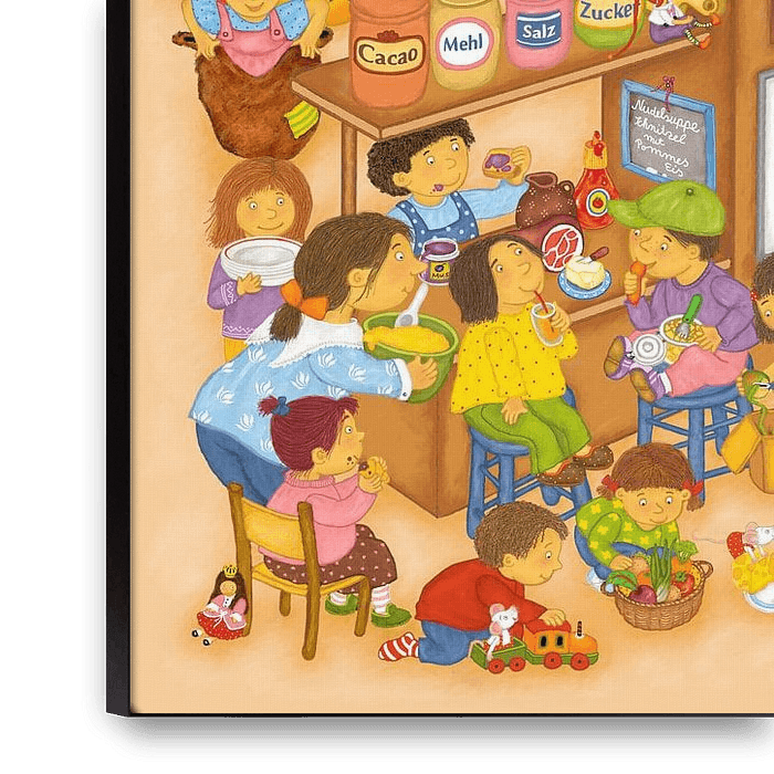 Bestelle diese Illustration Ein Tag im Kindergarten von Marion Krätschmer als Reproduktion auf Leinwand, Alu-Dibond, als Poster, Fototapete oder Acrylglasbild.
