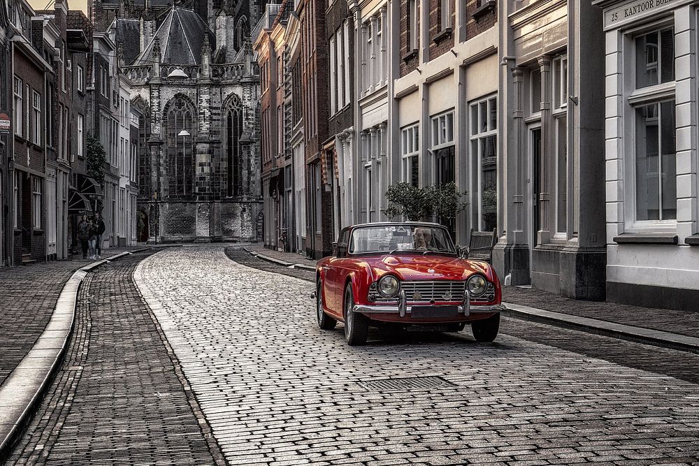Ein Triumph in der Nähe des Grotekerksbuurts in Dordrecht mit Blick auf die Grote Kerk. Das Bild wird in Schwarzweiß umgewandelt, wobei das Auto rot und der Sonnenuntergang in Farbe dargestellt wird.