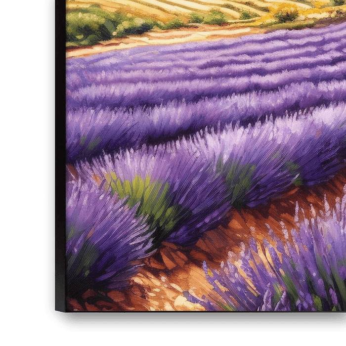 Der Weg in der Mitte des Gemäldes, der von Reihen duftenden lila Lavendels gesäumt ist, führt den Blick zu einem klassischen Steinhaus, das von üppigen Bäumen und den charakteristischen schlanken Zypressen umgeben ist, die oft mit mediterranen Regionen in Verbindung gebracht werden. Der Hintergrund offenbart atemberaubende Ausblicke auf sanfte Hügel und ferne Berge, alles unter einem dynamischen Himmel voller Wolken, die das Sonnenlicht auf unterschiedliche Weise einfangen. Der Einsatz von Licht und Farbe in diesem Gemälde ist meisterhaft. Warme Sonnenstrahlen beleuchten die Szene und heben die verschiedenen Violett-, Grün- und Erdtöne der Landschaft hervor.