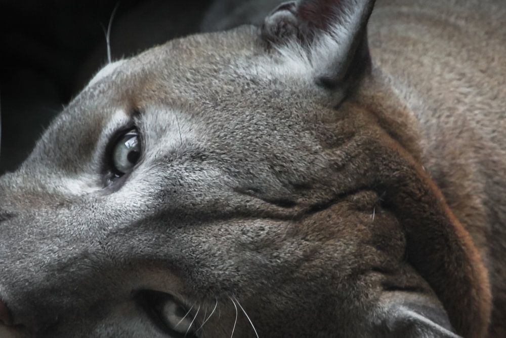 Ein mächtiger Puma liegt faul, aber gefährlich, ein Berglöwe Kopf Nahaufnahme auf der Seite, ein dunkler Hintergrund