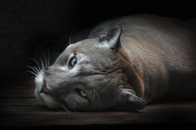 Über „Ein mächtiger Puma liegt faul, aber gefährlich, ein Berglöwe Kopf Nahaufnahme auf der Seite, ein dun“ von Michael Semenov