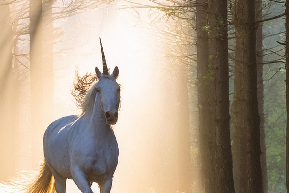 Einhorn; magisch; Pferd; Biest; Tier; Sonnenaufgang; sonniger Wald; Bäume; Märchen; Kinder; mythisch; Mythologie; läuft