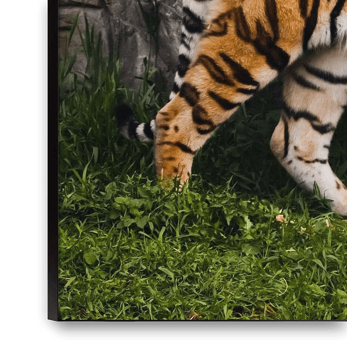 Bestelle das Foto Ein stolzer, geschmeidiger Tiger steht wunderschön an einer Steinklippe. Wunderschöne kräftige große von Michael Semenov als Reproduktion auf Leinwand, Alu-Dibond, als Poster, Fototapete oder Acrylglasbild.