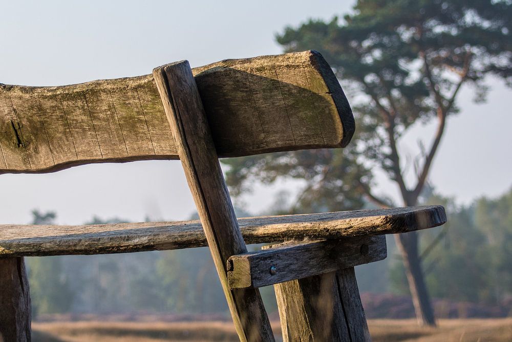 Es ist noch früh am Morgen, die Bank wärmt sich in der Morgensonne auf. Die Sonnenstrahlen verleihen der Landschaft einen warmen Glanz. Warten auf die Besucher, die später am Tag zu einem Spaziergang kommen.