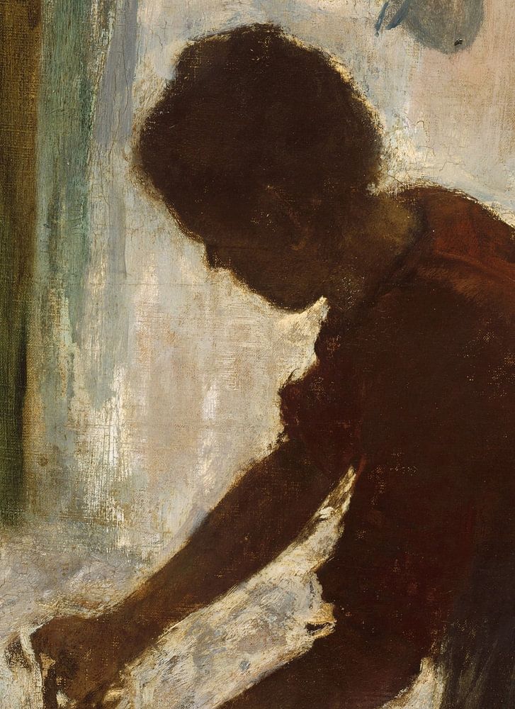 So sehr Degas durch die Bewegungen der Tänzer fasziniert war, wurde er auch von den sich wiederholend, spezialisierte Gesten von laundresses fasziniert, wie sie arbeiteten. Diese Malerei zeichnet sich durch sein dramatisches Hell-Dunkel unterscheiden, mit der Frau gegen einen hellen weißen Hintergrund abhebt.