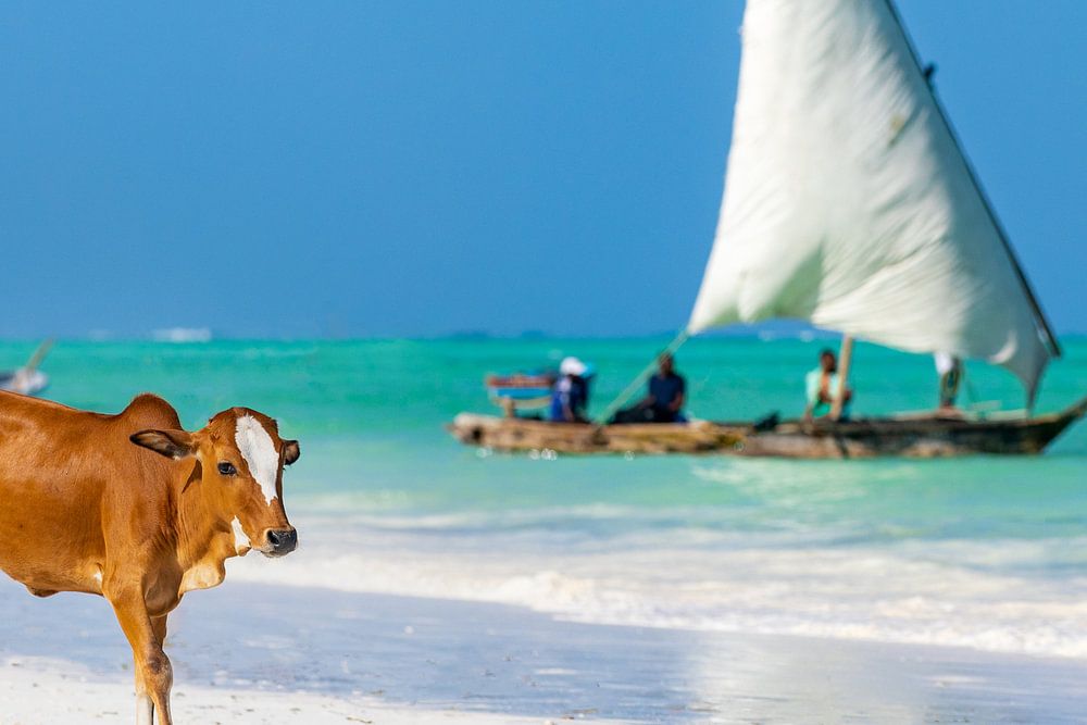 Der Strand in Paje auf Sansibar wird fast täglich von einer Kuhherde besucht, die zur Abkühlung kommt. Für die Einheimischen etwas ganz Alltägliches, für die Touristen aber ein lustiges und fotogenes Ereignis.