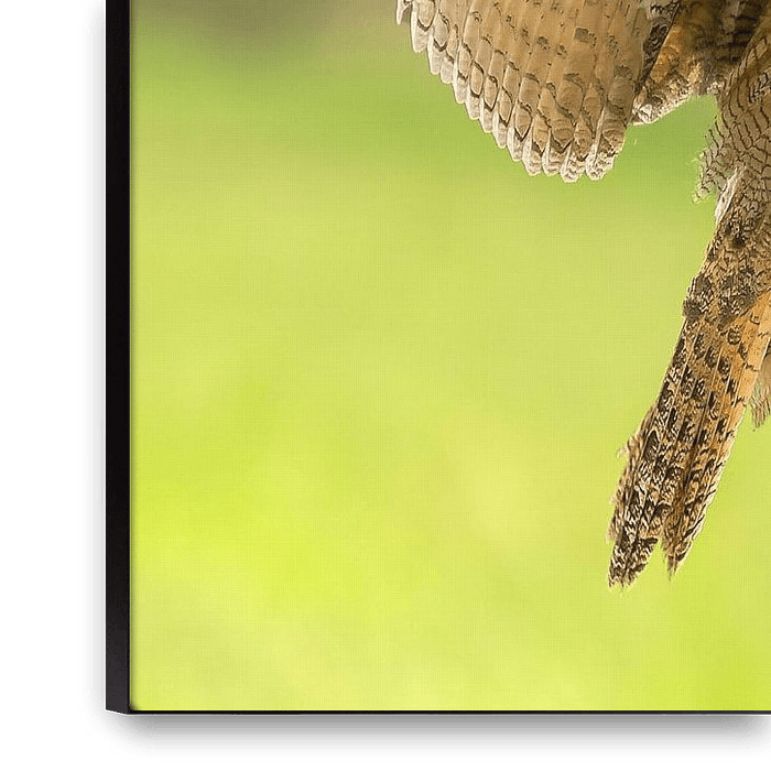 Bestelle dieses Vögel Wandbild Eine Landung des europäischen Uhus von Erik de Rijk als Reproduktion auf Leinwand, Alu-Dibond, als Poster, Fototapete, ArtFrame oder Acrylglasbild, maßgefertigt in höchster Qualität.