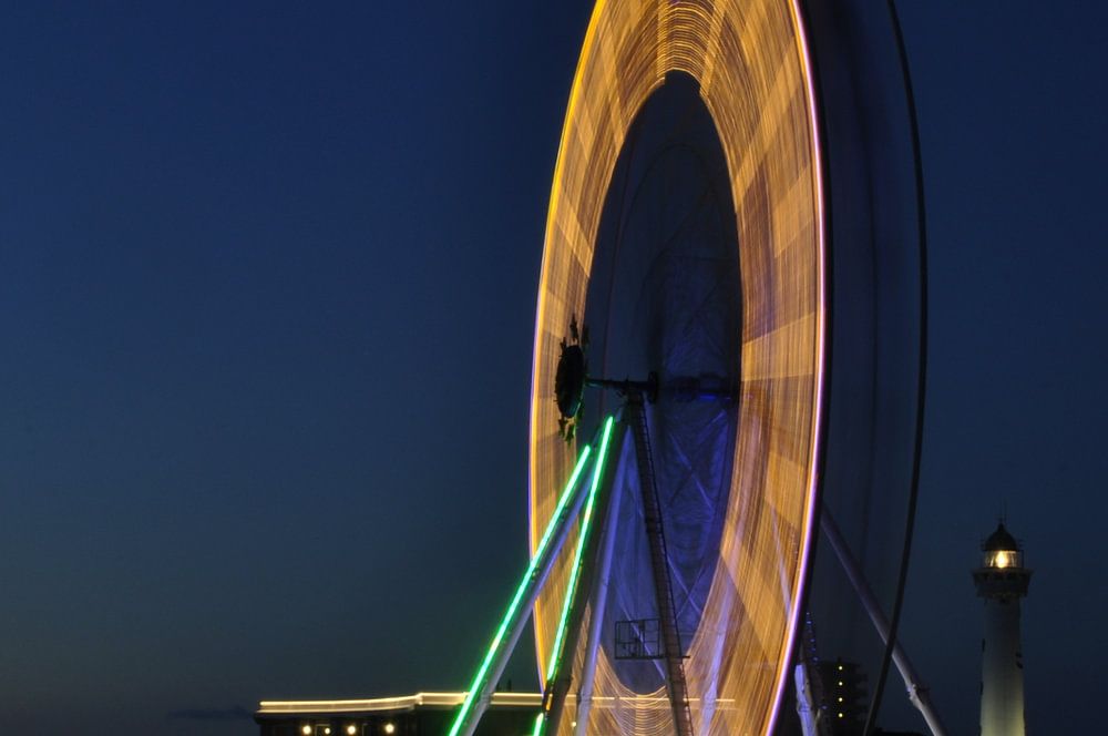 Kurz nach Sonnenuntergang wurde der Spaß mit dem Riesenrad mit langer Verschlusszeit eingefangen.
