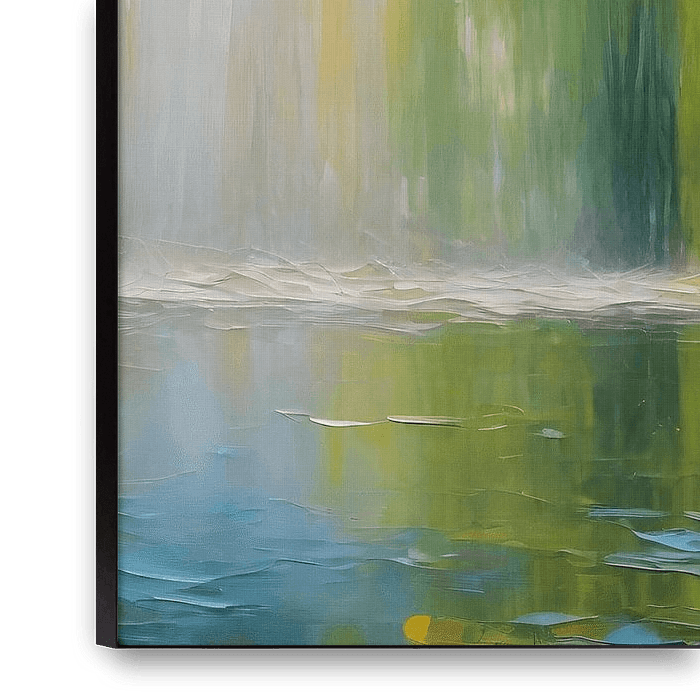 Ein abstraktes Gemälde einer Trauerweide am Wasser.