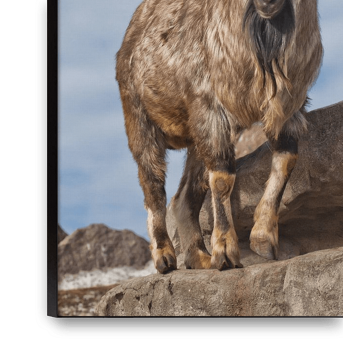 Bestelle das Foto Eine Ziege mit großen Hörnern steht allein auf einem Felsen, einer Berglandschaft und dem Himmel. Al von Michael Semenov als Reproduktion auf Leinwand, Alu-Dibond, als Poster, Fototapete oder Acrylglasbild.