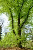 Diese Buche im Wald von Emmen hat gerade neue Blätter an den Zweigen bekommen. Andere Bäume in der Gegend sind noch kahl. Die Sonne scheint auf den Baum, wodurch die Blätter noch heller werden.