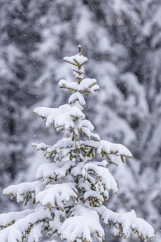 Der Wald ist mit einer dicken Schneedecke bedeckt. Auf eine kleine Lichtung ragt eine kleine Fichte gerade noch aus dem Schnee heraus.