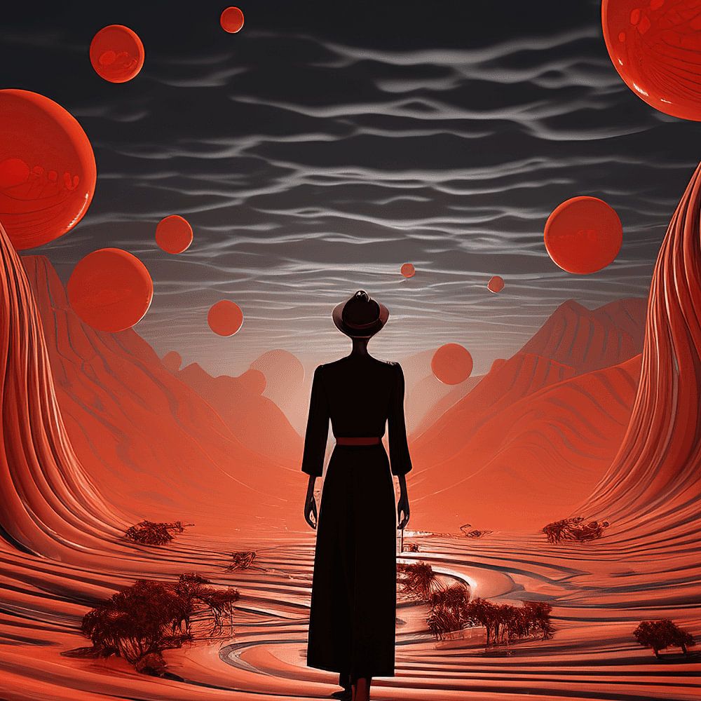Ein digitales Kunstwerk, das eine Frau in einem roten Kleid zeigt, die auf einem schwarz-weiß gestreiften Weg durch eine Wüstenlandschaft mit roten Sanddünen und schwebenden roten Kugeln geht.