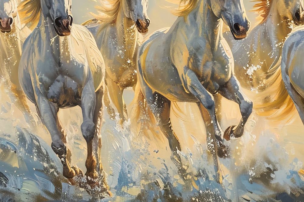 Das Kunstwerk zeigt eine Herde von Pferden, die über das Wasser galoppieren. Jedes Pferd ist weiß mit goldener Mähne und Schweif und hinterlässt Wellen in seinem Weg. Der Hintergrund ist ein klarer Himmel, die Farben sind sanfte Pastelltöne und schaffen eine Atmosphäre von Freiheit und Ruhe.