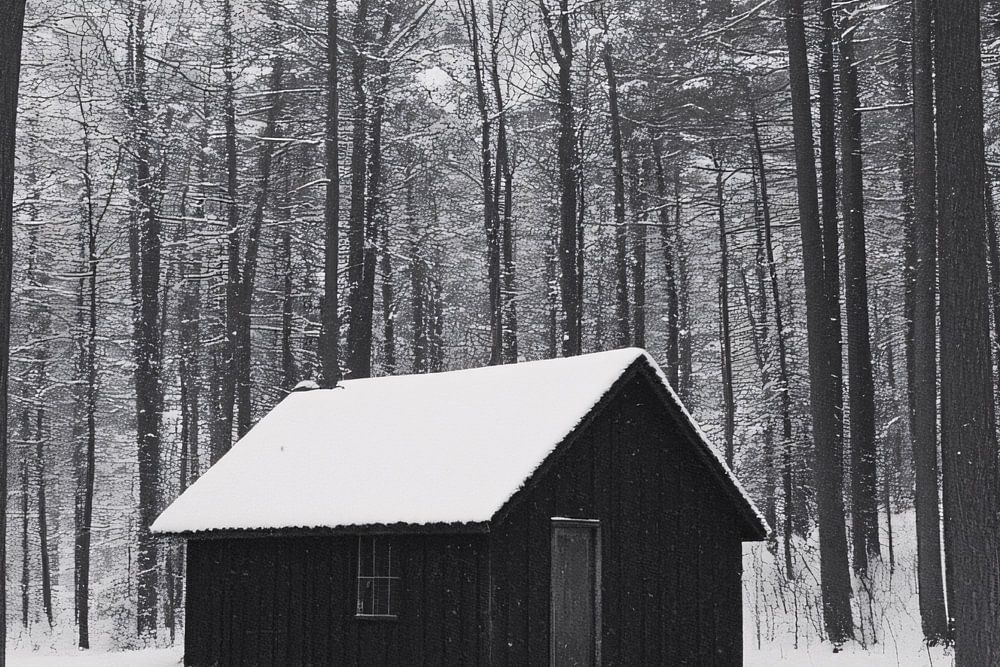 Dieses stimmungsvolle Foto fängt eine ruhige Winterszene ein, in der eine einsame Holzhütte in einem verschneiten Wald steht. Die dunkle Farbe der Hütte steht in schönem Kontrast zu dem weißen Schnee, der den Boden und die Bäume bedeckt, und schafft eine ruhige, fast magische Atmosphäre. Dieses Bild ist perfekt für alle, die Minimalismus und die Ruhe der Natur lieben. Das Design strahlt Einfachheit aus und unterstreicht die Schönheit der Abgeschiedenheit in einer verschneiten Landschaft. Ideal für eine beruhigende Ergänzung in einem modernen Interieur, wo eine monochrome Ästhetik geschätzt wird.