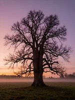 Ein majestätischer, kahler Baum steht zentral in einer offenen Landschaft, umgeben von sanftem Morgennebel und warmen Sonnenaufgangsfarben. Die verzweigte Silhouette hebt sich klar vom Himmel ab und erzeugt eine starke grafische Wirkung. Dieses Motiv symbolisiert Ruhe, Beständigkeit und zeitlose Schönheit. Die Farbpalette aus sanften…