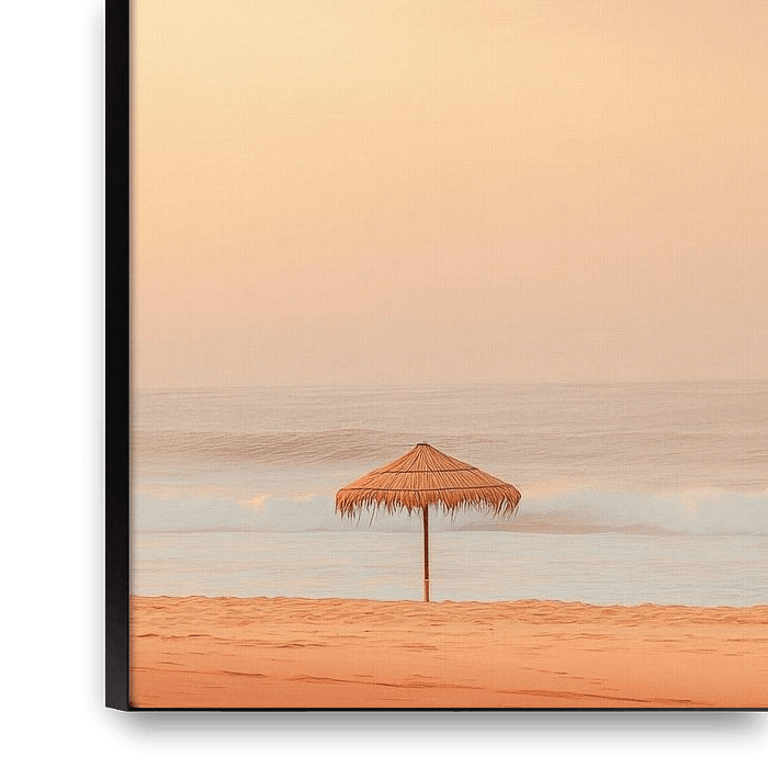 Ein sanfter Farbverlauf aus Pastelltönen umschmeichelt den Horizont, während die ruhigen Wellen sanft den Sand umspülen. Eine einsame Strandliege mit schattenspendendem Dach steht im Mittelpunkt und lädt zur Entspannung ein. Der gesamte Anblick strahlt eine friedliche Stille und das Versprechen verführerischer Urlaubsstunden aus.