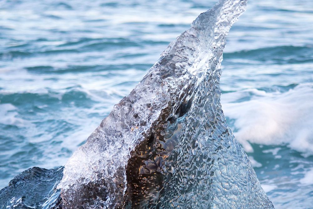 Ein Eisbrocken wurde in Island in der Nähe des Gletschersees Jökulsárlón an Land gespült.