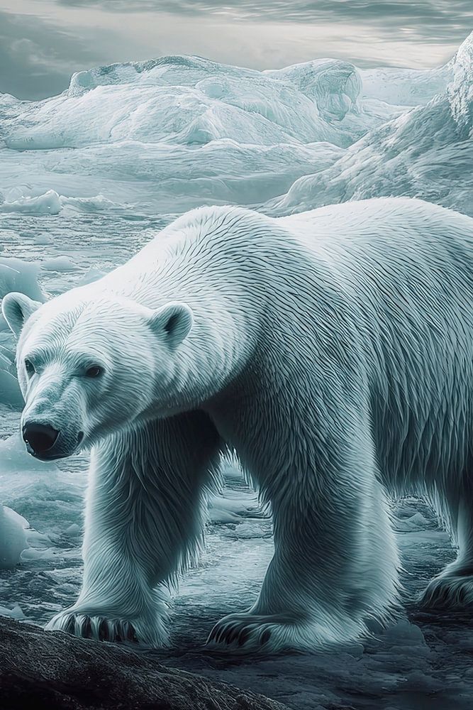Ein majestätischer Eisbär durchstreift eine eisige, geheimnisvolle Landschaft, umgeben von schimmernden Eisflächen und dramatischen Wolken. Die kühle Farbpalette vermittelt eine Atmosphäre von Ruhe und Anmut. Dieses Bild eignet sich hervorragend für das Wohnzimmer, wo es die Blicke auf sich zieht und Gespräche anregt. Ideal für Tierliebhaber und Naturfreunde.