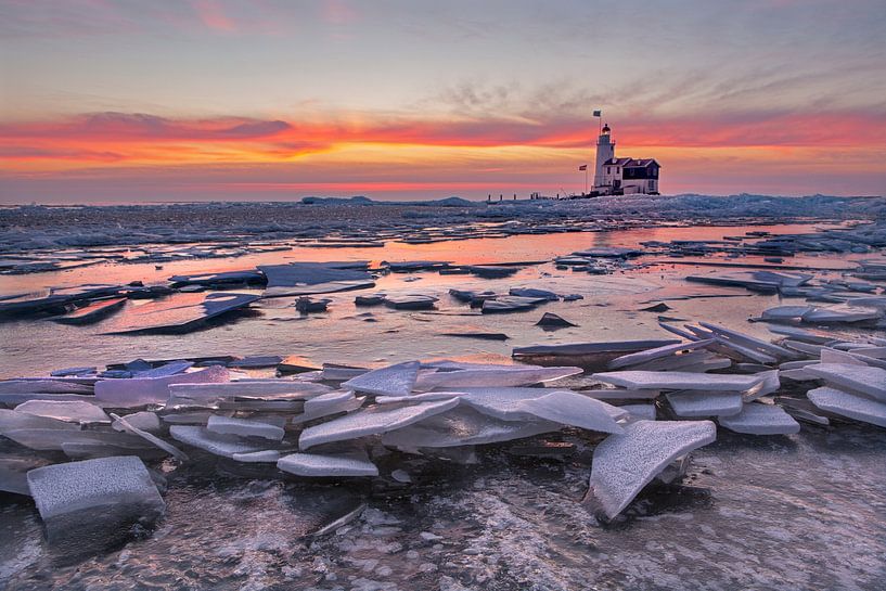 Eisschollen auf Leuchtturm 'Het Paard van Marken' auf der Halbinsel Marken, Niederlande