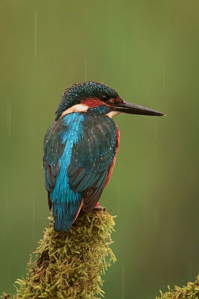 Stimmungsvolles Foto eines Eisvogels in Rückansicht, wobei das farbenfrohe Gefieder einen wunderschönen Kontrast zur regnerischen Umgebung bildet. Das Bild strahlt Ruhe und Intimität aus und zeigt auf subtile Weise die charakteristischen Formen und Farben dieses ikonischen Vogels.