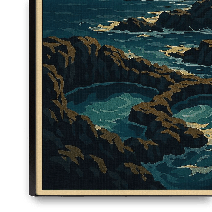 Bestelle dieses Landschafts-Wandbild El Hierro Art Deco Küstenlandschaft Poster von Travel Shop als Reproduktion auf Leinwand, Alu-Dibond, als Poster, Fototapete oder Acrylglasbild.