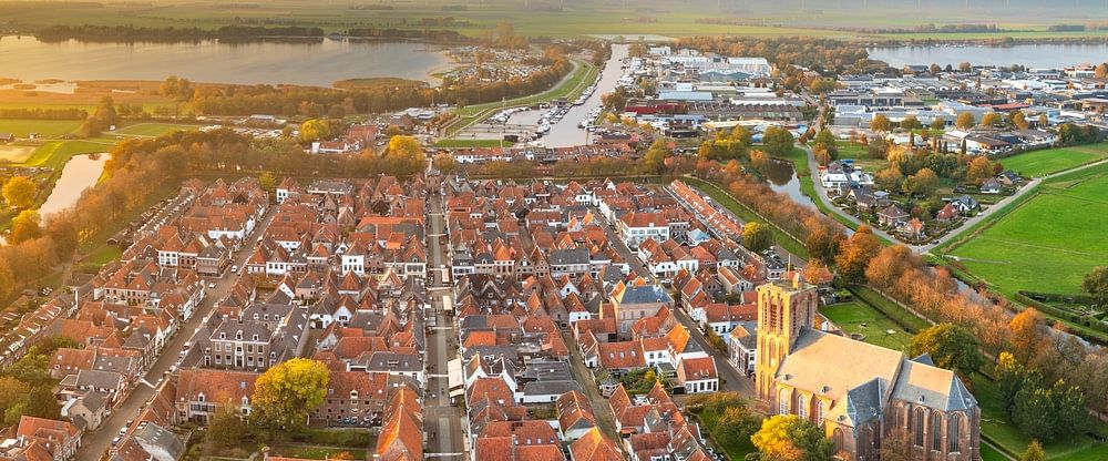 Die alte Festungsstadt Elburg von oben an einem schönen Herbsttag in Gelderland, Niederlande. Elburg war früher ein Fischerdorf, ist aber heute aufgrund seiner Lage in der Nähe des Veluwemeers und der Veluwe als beliebte Reiseziele mehr auf den Tourismus ausgerichtet.