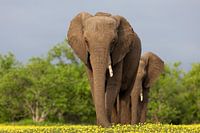 Diese Elefanten laufen durch ein Feld mit blühendem Devil's Thorn. Die gelben Blüten bilden einen gelben Teppich. Die niedrige Position sorgt für ein beeindruckendes Bild der Elefantenrüssel.