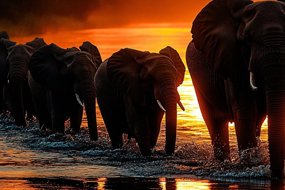 Dieses wunderschöne Motiv zeigt eine Elefantenherde, die während eines atemberaubenden Sonnenuntergangs durch einen Fluss zieht. Das warme Licht der Sonne färbt das Wasser in leuchtenden Orange- und Goldtönen, während die Silhouetten der Tiere eine heitere und majestätische Atmosphäre schaffen. Ideal für Naturliebhaber, die ihre Innenräume mit einem kraftvollen und beruhigenden Bild bereichern wollen. Dieses Kunstwerk strahlt Dynamik und Ruhe aus und ist ideal, um einem Raum eine warme und einzigartige Atmosphäre zu verleihen.