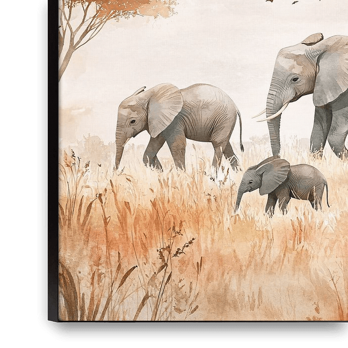 Dieses wunderschöne Aquarell zeigt eine friedliche Elefantenfamilie, die durch die warme Savanne schlendert. Die sanften Sepia- und Erdtöne schaffen eine beruhigende Atmosphäre und machen dieses Gemälde perfekt für das Wohnzimmer oder das Büro. Die majestätischen Elefanten sind von trockenem Gras umgeben und werden von Vögeln begleitet,…