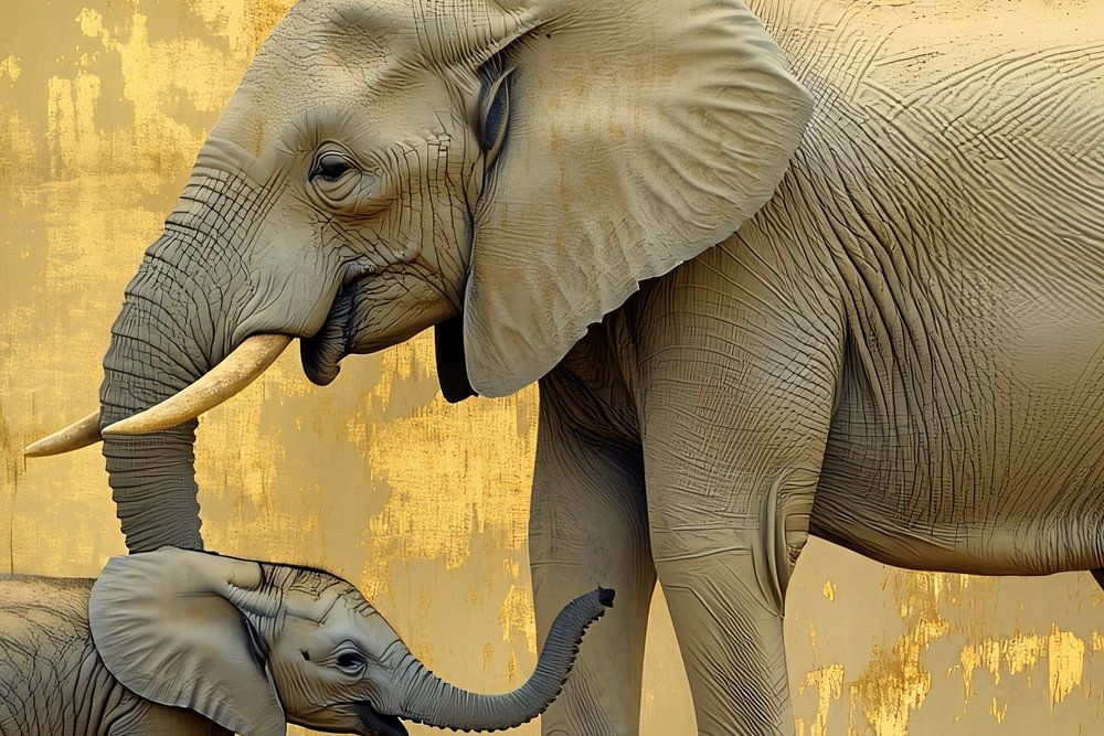 Ein wunderschönes Design mit einer Elefantenmutter und ihrem Kalb, umrahmt von einem eleganten goldenen Hintergrund. Dieses Kunstwerk strahlt Wärme, Verbundenheit und Natur aus, perfekt für Tierliebhaber und anspruchsvolle Dekorationen. Eine ideale Wahl, um ein Wohn- oder Esszimmer mit einem Stück natürlicher Eleganz und einem goldenen Touch zu bereichern.