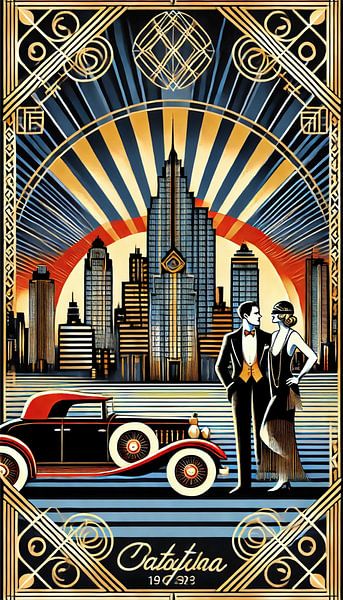 Goldene Zeiten – Art Déco Poster mit elegantem Paar & Skyline der 1920er