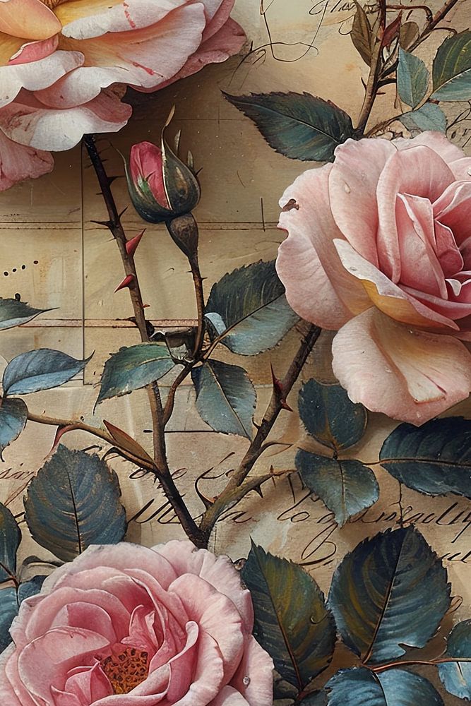 Eine wunderschöne Darstellung von Rosen vor einem nostalgischen Briefhintergrund mit einem Hauch von Romantik.