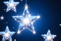 Das Motiv zeigt leuchtende Weihnachtssterne mit feinem Glitzer auf einem tiefdunklen Blau als stilvollen Hintergrund, gestaltet als hochwertiges 3D‑Rendering für festliche Anwendungen. Mehrere Sterne unterschiedlicher Größe schweben räumlich vor der Fläche; ihre Oberflächen sind facettiert oder leicht gewölbt und reflektieren das Licht…
