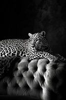 Ein majestätischer Leopard entspannt sich in eleganter Pose auf einem luxuriösen, gepolsterten Sofa. Das Zusammenspiel von Schwarz und Weiß verstärkt die faszinierende Musterung seines Fells und verleiht dem Raum eine kraftvolle Atmosphäre. Ideal für ein Wohnzimmer oder ein stilvolles Büro, wo er als Blickfang glänzen kann.