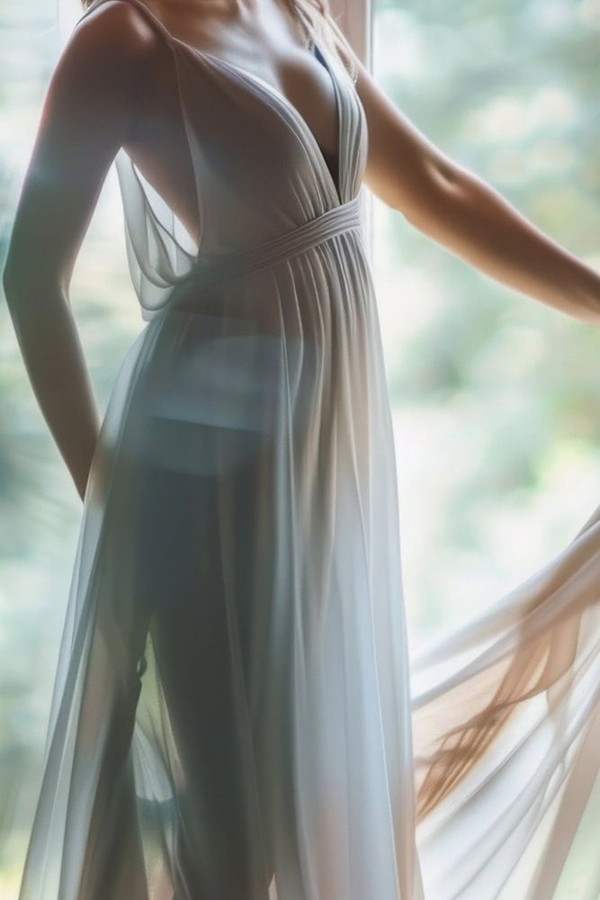 Das Bild zeigt eine elegante Frau in einem fließenden, transparenten Kleid, das sanft ihre Silhouette umschmeichelt. Sie steht an einem Fenster, das von weichem, natürlichem Licht durchflutet wird, während draußen die grüne Landschaft unscharf angedeutet ist. Ihr Ausdruck vermittelt Anmut und Nachdenklichkeit, was die Szene besonders bezaubernd macht.