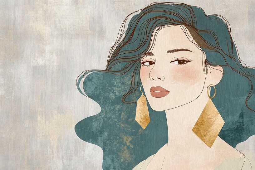 Eleganz und Stil vereinen sich in diesem faszinierenden Porträt einer selbstbewussten Frau. Ihre sanften Gesichtszüge und die schimmernden, goldenen Ohrringe verleihen dem Bild einen Hauch von Glamour. Die harmonischen Farben und die fließenden Linien machen es ideal für ein modernes Wohnzimmer, wo es mit Leichtigkeit zur Geltung kommt.