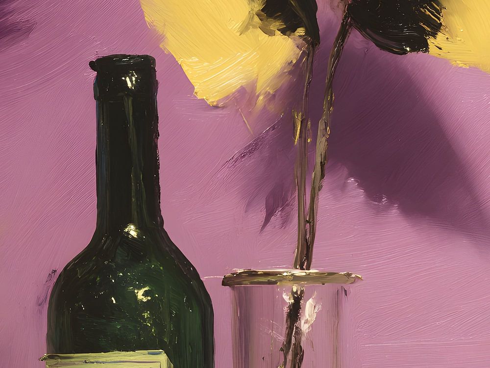 Dieses lebendige Stillleben zeigt ein faszinierendes Zusammenspiel von Farbe und Form. Eine grüne Flasche steht prominent neben zarten Blumen, deren Blütenblätter in kräftigen Gelbtönen und tiefem Schwarz gehalten sind, vor einem sanften violetten Hintergrund. Die Pinselführung vermittelt ein Gefühl von Bewegung, als würden die Blumen im Licht tanzen. Dieses Werk lädt den Betrachter dazu ein, die Schönheit alltäglicher Gegenstände zu schätzen, und verwandelt sie in einen lebhaften Gesprächsaufhänger. Dieses Kunstwerk ist perfekt, um Ihrem Raum einen Hauch von Farbe und Persönlichkeit zu verleihen, und wird jeden Raum aufhellen.