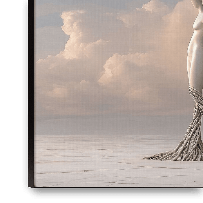 Surreale Konzeptkunst in sanften Naturtönen zum Thema Umwelt und Klimawandel.